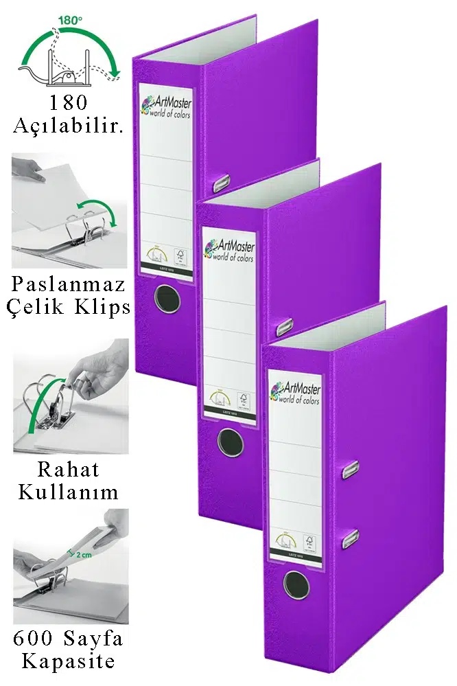 Ürün Adı: Artmaster Büro Klasörü Mor Geniş 3 Adet Plastik Geniş Mor Klasör Halkalı Paslanmaz Çelik Klipsli Ofis Büro