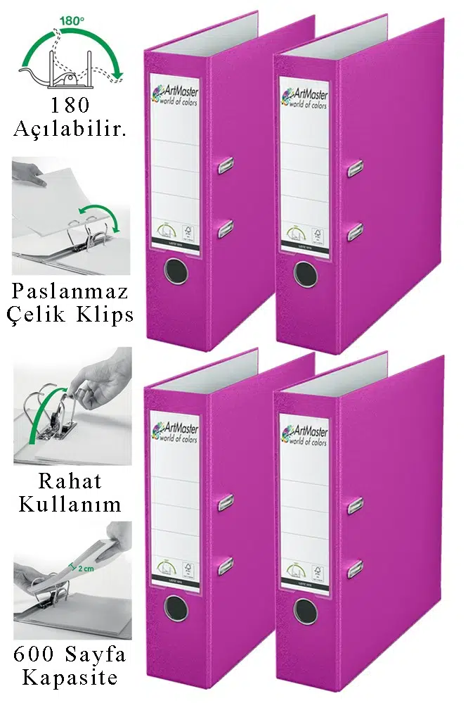 Ürün Adı: Artmaster Büro Klasörü Pembe Geniş 4 Adet Plastik Geniş Pembe Klasör Halkalı Paslanmaz Çelik Klipsli Ofis Büro