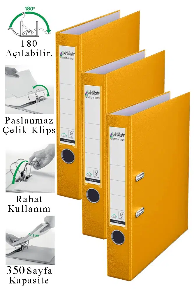 Ürün Adı: Artmaster Büro Klasörü Sarı Dar 3 Adet Plastik Dar Sarı Klasör Halkalı Paslanmaz Çelik Klipsli Ofis Büro