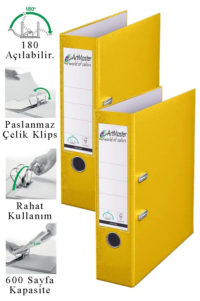 Ürün Adı: Artmaster Büro Klasörü Sarı Geniş 2 Adet Plastik Geniş Sarı Klasör Halkalı Paslanmaz Çelik Klipsli Ofis Büro