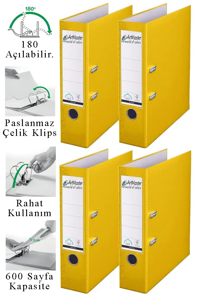 Ürün Adı: Artmaster Büro Klasörü Sarı Geniş 4 Adet Plastik Geniş Sarı Klasör Halkalı Paslanmaz Çelik Klipsli Ofis Büro