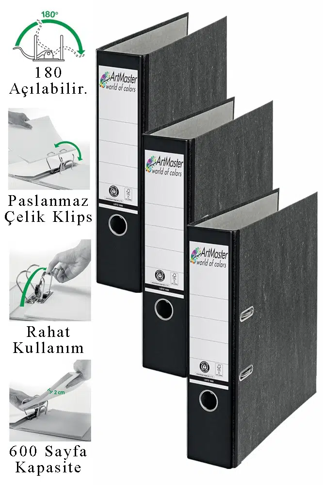 Ürün Adı: Artmaster Büro Klasörü Siyah Geniş 3 Adet Plastik Geniş Siyah Klasör Halkalı Paslanmaz Çelik Klipsli Ofis Büro