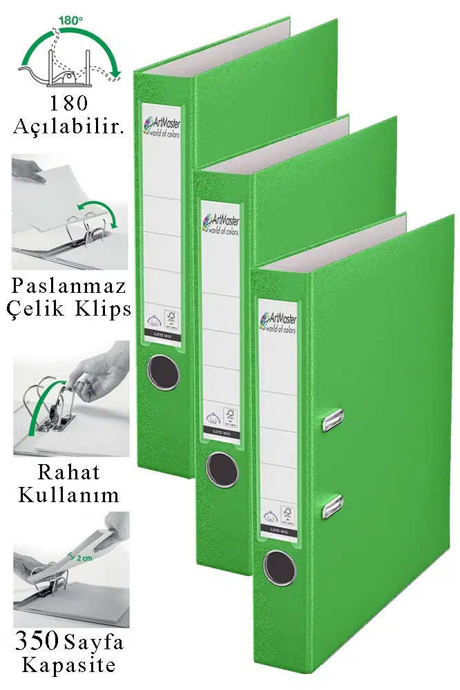 Ürün Adı: Artmaster Büro Klasörü Yeşil Dar 3 Adet Plastik Dar Yeşil Klasör Halkalı Paslanmaz Çelik Klipsli Ofis Büro