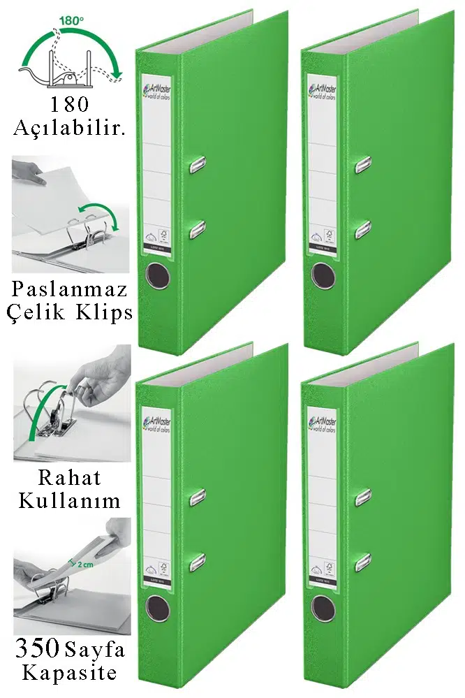 Ürün Adı: Artmaster Büro Klasörü Yeşil Dar 4 Adet Plastik Dar Yeşil Klasör Halkalı Paslanmaz Çelik Klipsli Ofis Büro