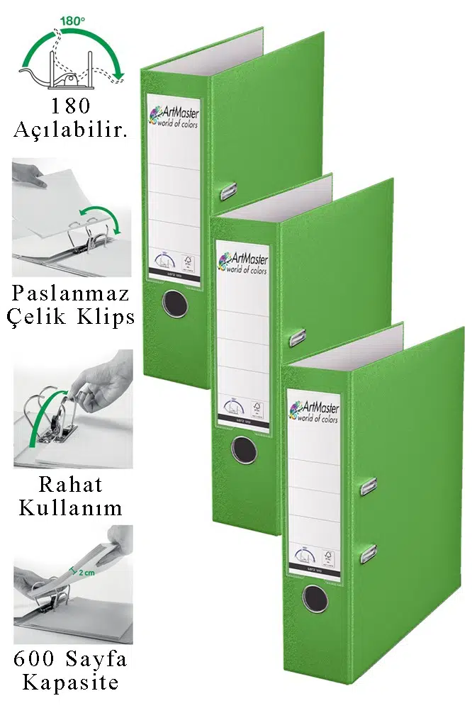Ürün Adı: Artmaster Büro Klasörü Yeşil Geniş 3 Adet Plastik Geniş Yeşil Klasör Halkalı Paslanmaz Çelik Klipsli Ofis Büro