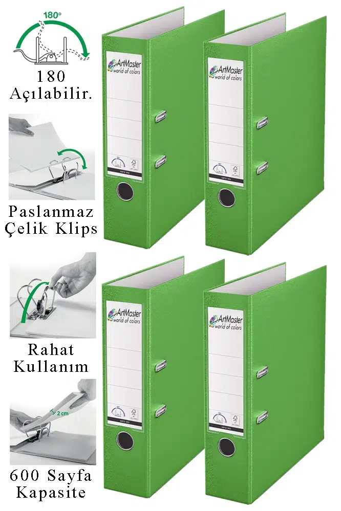 Ürün Adı: Artmaster Büro Klasörü Yeşil Geniş 4 Adet Plastik Geniş Yeşil Klasör Halkalı Paslanmaz Çelik Klipsli Ofis Büro