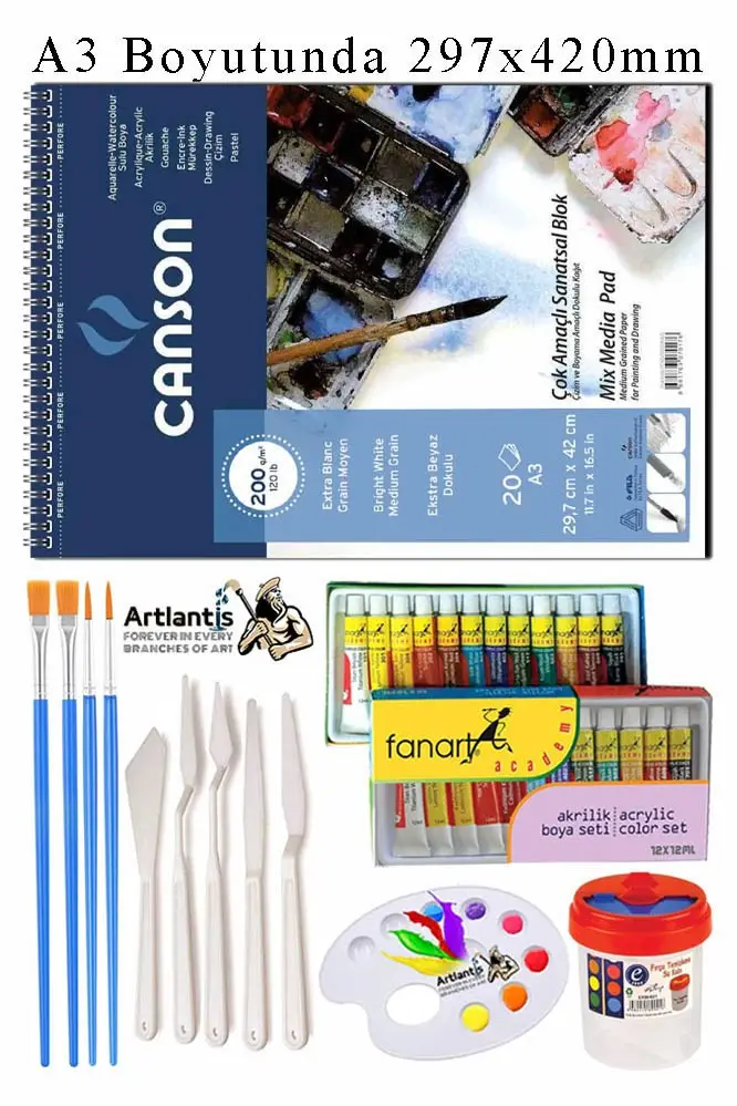 Ürün Adı: Canson Çok Amaçlı Sanatsal Blok A3 200 gr 20 Yaprak 1 Adet 12 Renk Akrilik Boya Fırça Palet Spatula Fırça Temizleme Kabı