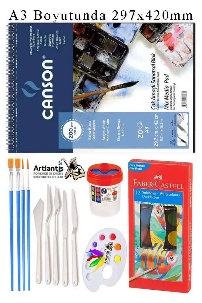 Ürün Adı: Canson Çok Amaçlı Sanatsal Blok A3 200 gr 20 Yaprak 1 Adet 12 Renk Sulu Boya Fırça Palet Spatula Fırça Temizleme Kabı