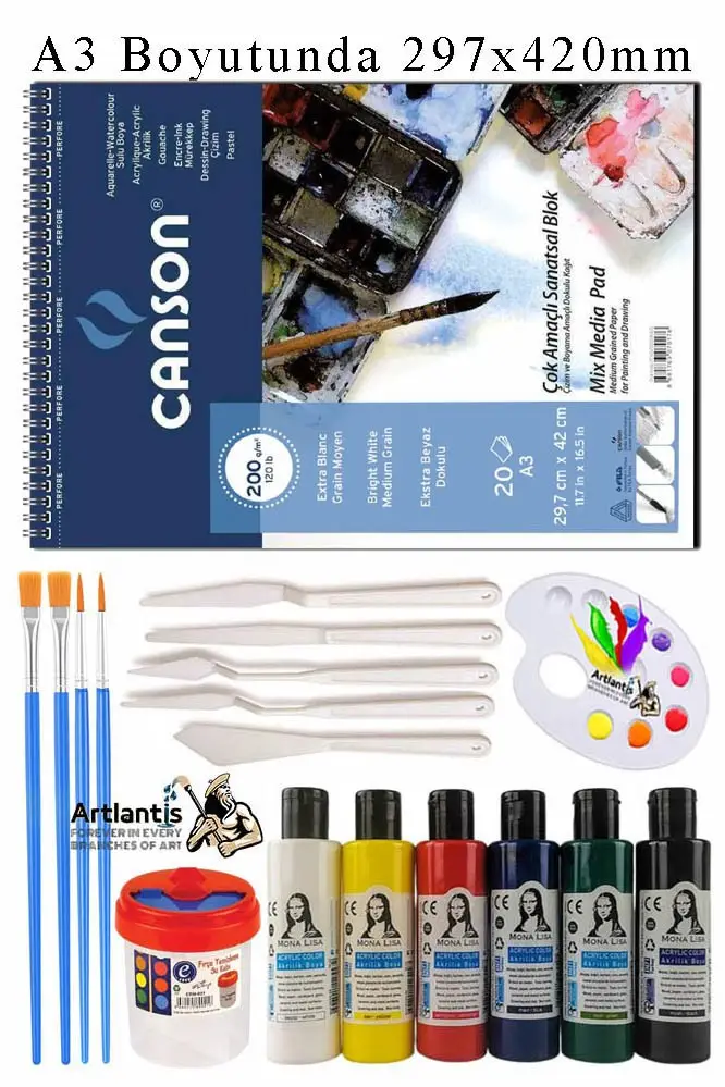 Ürün Adı: Canson Çok Amaçlı Sanatsal Blok A3 200 gr 20 Yaprak 1 Adet 6 Renk Akrilik Boya Fırça Palet Spatula Fırça Temizleme Kabı