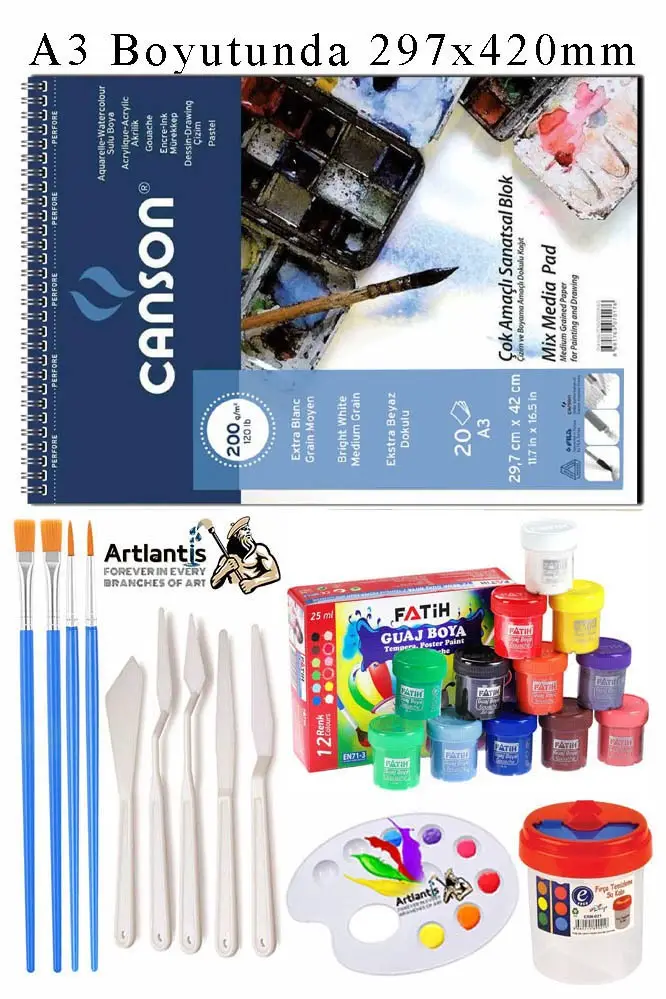 Ürün Adı: Canson Çok Amaçlı Sanatsal Blok A3 200 gr 20 Yaprak 1 Adet 6 Renk Guaj Boya Fırça Palet Spatula Fırça Temizleme Kabı