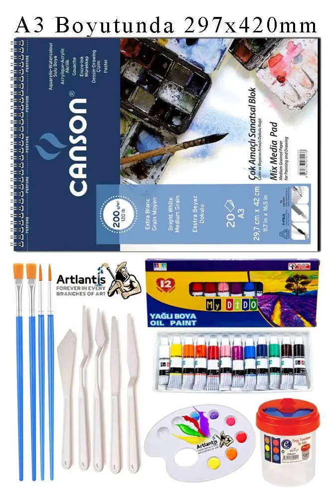 Ürün Adı: Canson Çok Amaçlı Sanatsal Blok A3 200 gr 20 Yaprak 1 Adet Mydido 12 Renk Yağlı Boya Fırça Palet Spatula Fırça Temizleme