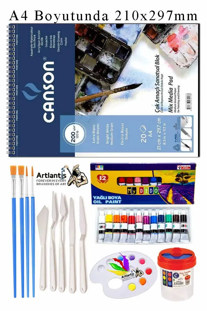 | Etiketler | Canson Çok Amaçlı Sanatsal Blok A4 200 gr 20 Yaprak 1 Adet Mydido 12 Renk Yağlı Boya Fırça Palet Spatula Fırça Temizleme |