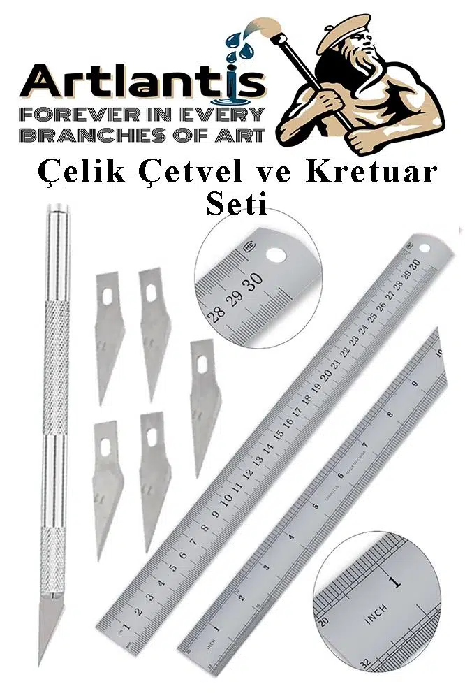 Ürün Adı: Çelik Cetvel 30 cm ve Kretuar Bıçağı 5 Yedek Bıcaklı 1 Adet Paslanmaz Çelik Metal Çetvel 30 Santimetre