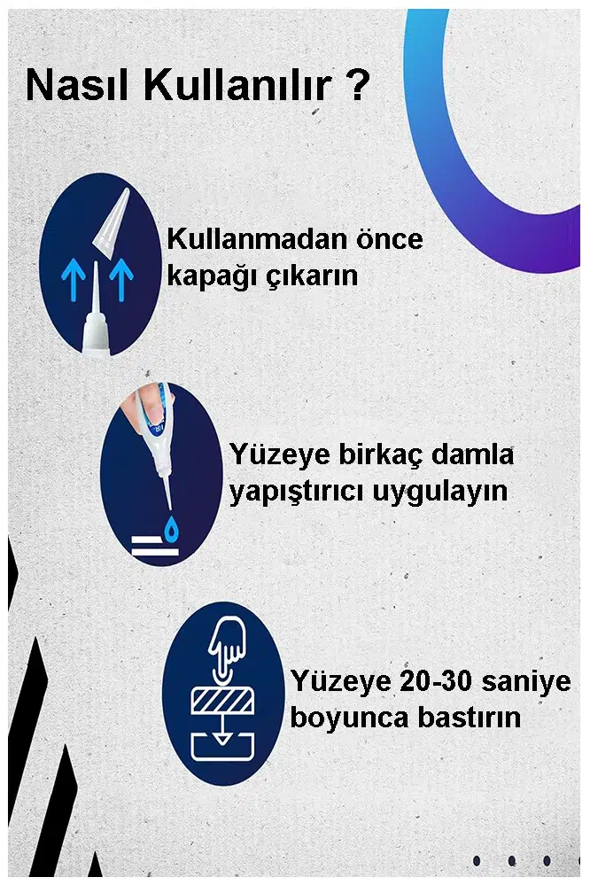 ·Yapıştırılacak yüzeyleri toz, kir ve yağdan temizledikten sonra yüzeylerden birine az miktarda yapıştırıcı sürerek her iki yüzeyi bir birine temas ettirerek bir kaç saniye basınç uygulayınız.