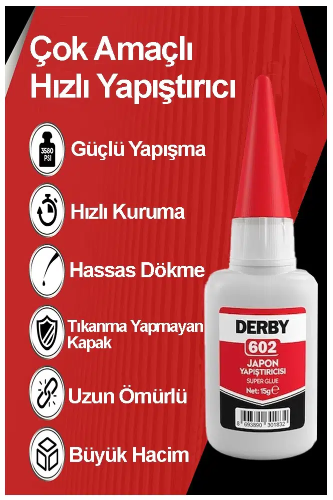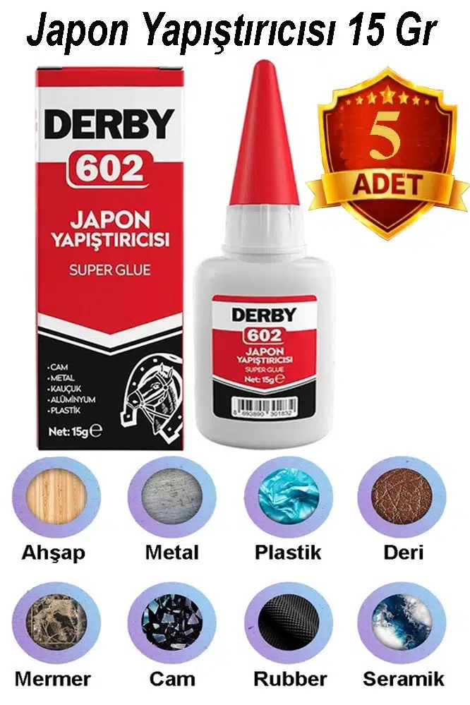 Ürün Adı: Derby 602 Japon Yapıştırıcı 15 gr 5 Adet Yüksek Yapıştırma Gücü Tek Bileşenli Düşük Viskozite Güçlü Yapıştırıcı 15gr