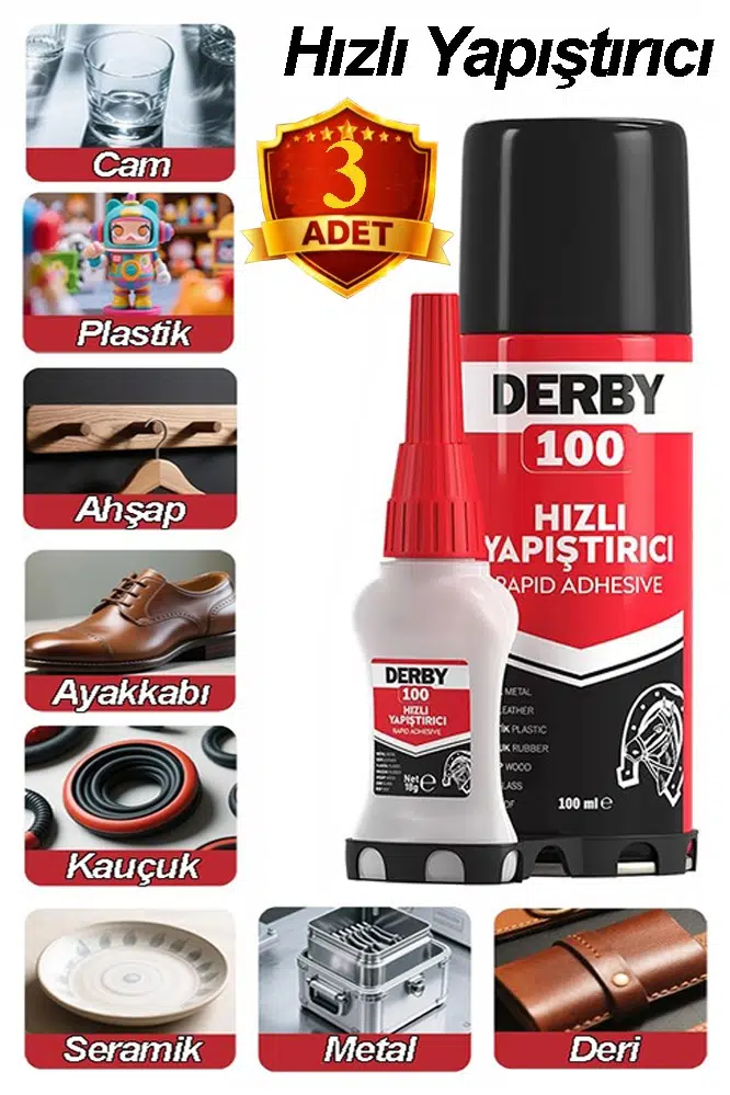 Ürün Adı: Derby Hızlı Yapıştırıcı Seti 100 ml 3 Adet Ahşap ve Plastik Yüzeyler İçin Yüksek Yapıştırma Gücü Düşük Viskozite 100 ml