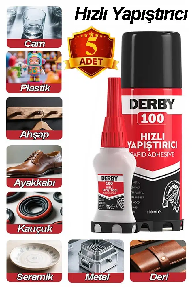 Ürün Adı: Derby Hızlı Yapıştırıcı Seti 100 ml 5 Adet Ahşap ve Plastik Yüzeyler İçin Yüksek Yapıştırma Gücü Düşük Viskozite 100 ml
