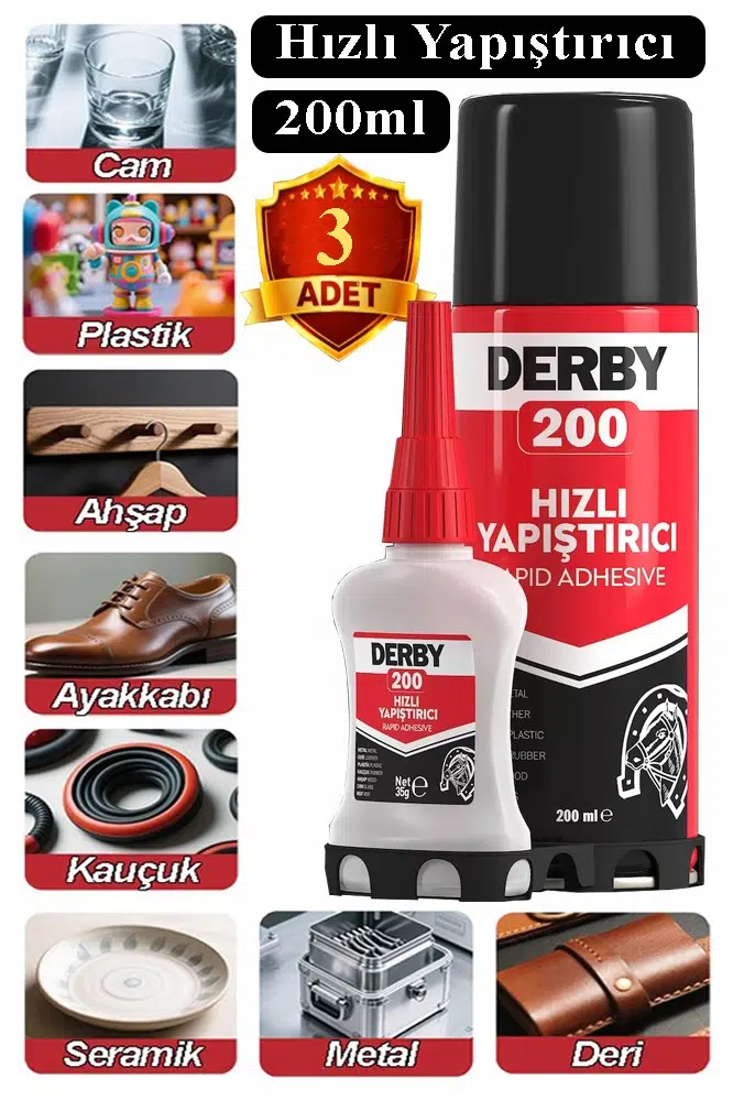 Ürün Adı: Derby Hızlı Yapıştırıcı Seti 200 ml 3 Adet Ahşap ve Plastik Yüzeyler İçin Yüksek Yapıştırma Gücü Düşük Viskozite 200 ml