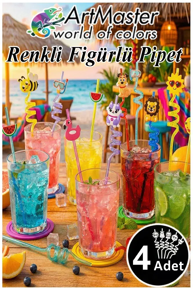 Ürün Adı: Artmaster Figürlü Pipet 4 Adet Sevimli Renkli Kıvrımlı Pipet 26 cm Ev Dekoratif Kokteyl Yıkanabilir Emoji Çocuklar İçin