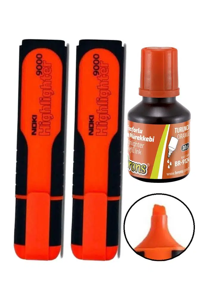 Ürün Adı: Noki Doldurulabilir Turuncu Fosforlu İşaret Kalemi 2 Adet ve 1 Adet Mürekkebi 30 ml
