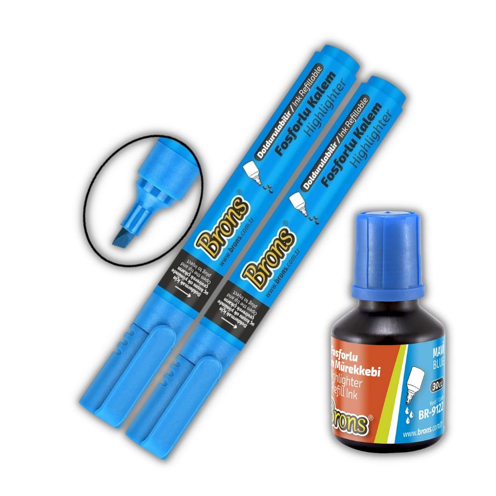 Ürün Adı: Brons Doldurulabilir Mavi Fosforlu İşaret Kalemi 2 Adet ve 1 Adet Mürekkebi 30 ml