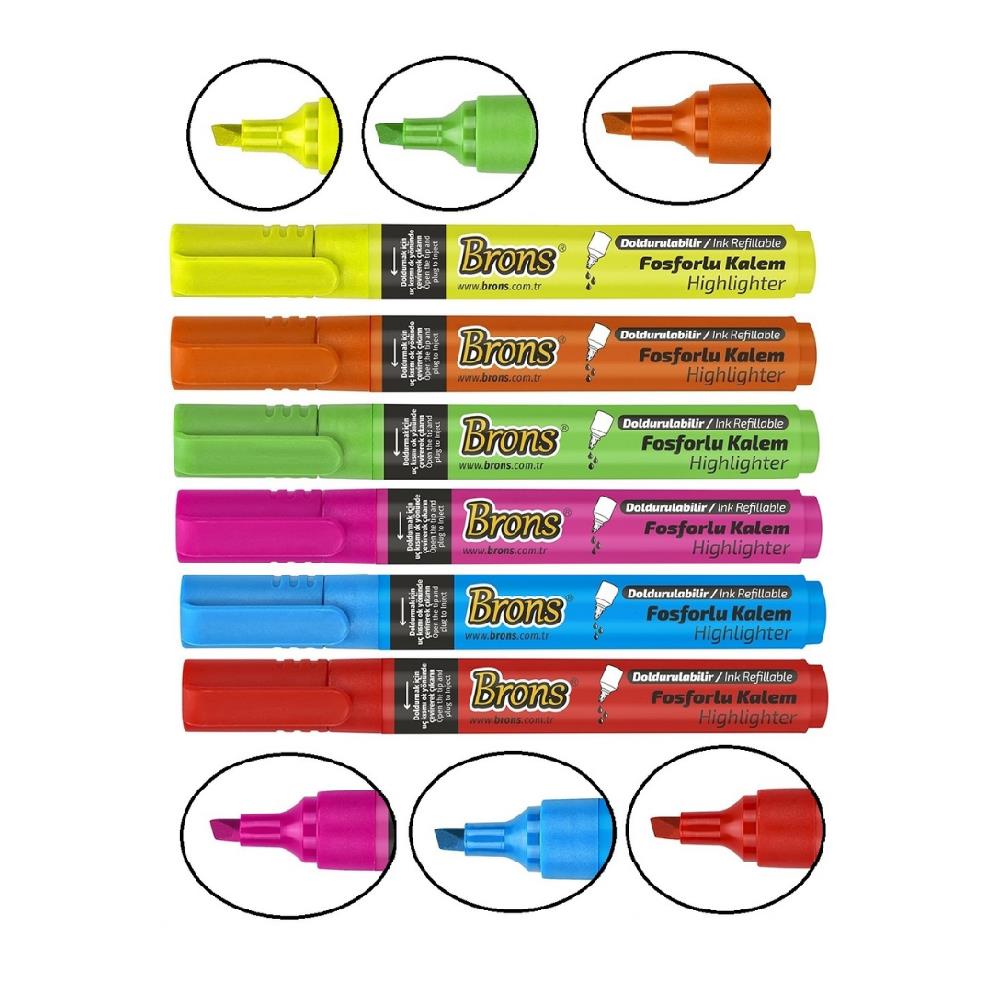 Ürün Adı: Brons Doldurulabilir Yeşil Mavi Kırmızı Sarı Turuncu Pembe Fosforlu İşaret Kalemi 6 Adet