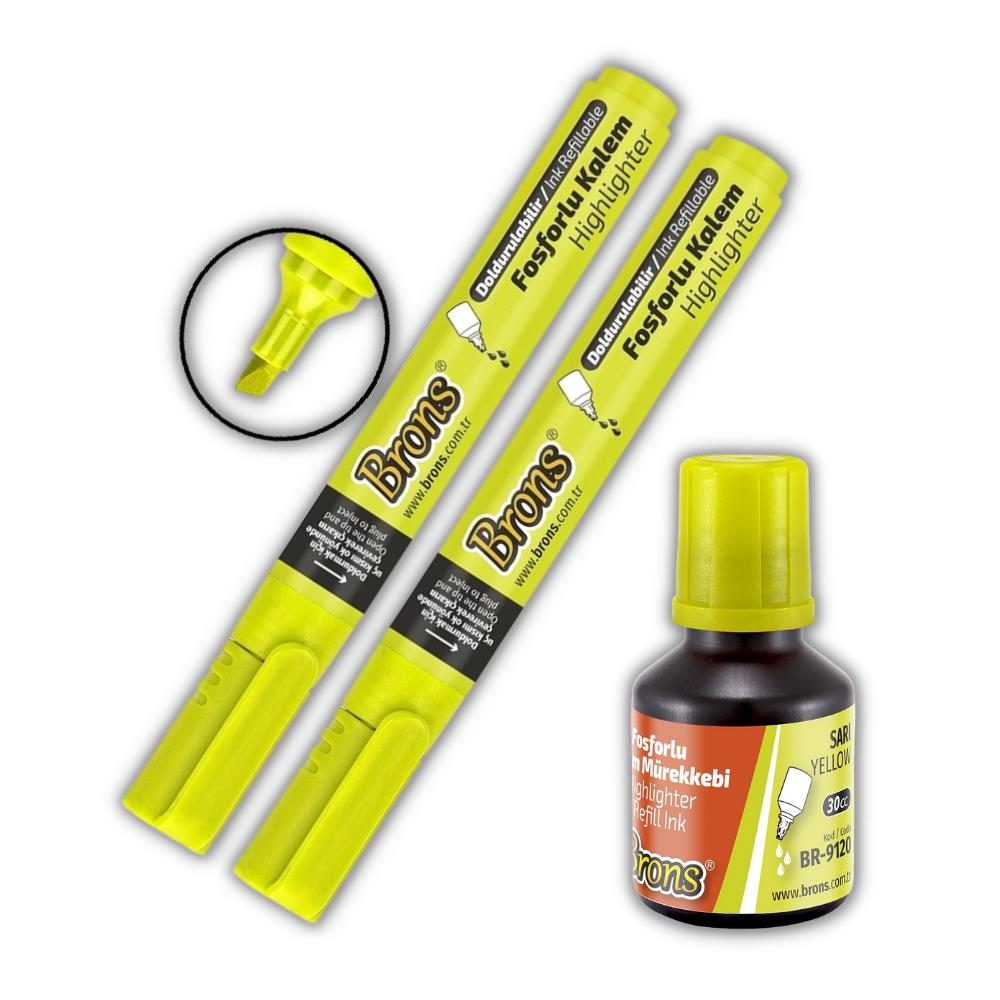 Ürün Adı: Brons Doldurulabilir Sarı Fosforlu İşaret Kalemi 2 Adet ve 1 Adet Mürekkebi 30 ml