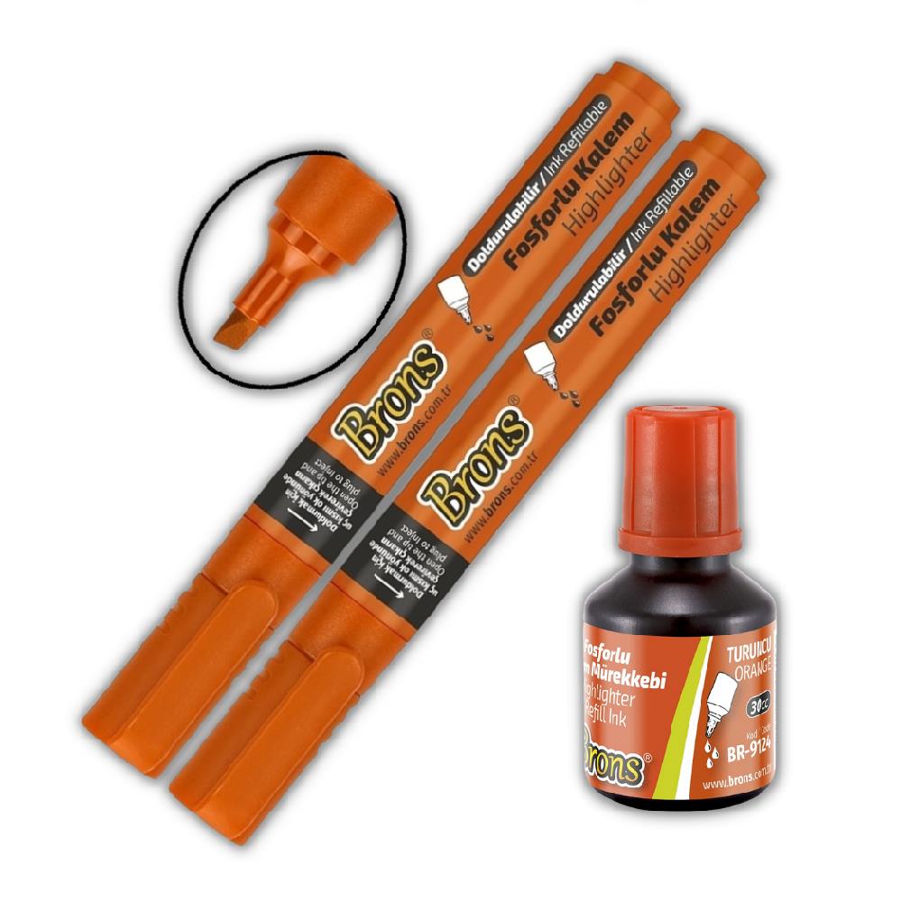 Ürün Adı: Brons Doldurulabilir Turuncu Fosforlu İşaret Kalemi 2 Adet ve 1 Adet Mürekkebi 30 ml