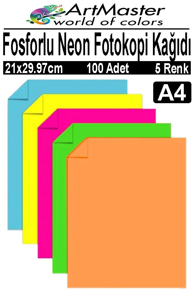 Ürün Adı: Fosforlu Neon Renkli A4 Fotokopi Kağıdı 100 Adet 1 Paket Fosforlu 5 Renk Parlak Canlı Renkler Neon Fotokopi Kağıdı