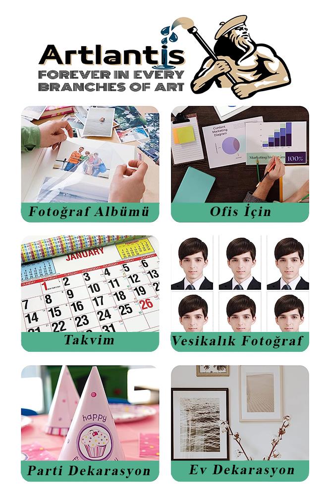 · Artlantis Fotoğraf Kağıdı, ipeksi kuşe türünde bir kağıt olup yüksek çözünürlüklü çıktılar almayı sağlayan bir üründür. Bu ürün, Canon ve Epson gibi markalara ait mürekkepli yazıcılarda da kullanılabilir. Cihazınızda baskı kalitesini "çok iyi" ya da "yüksek kalite" olarak seçtiğinizde oldukça kaliteli çıktılar alabilirsiniz. Çıktı çözünürlüğü gayet yüksek bir üründür.