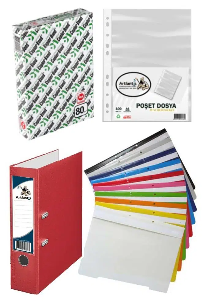 Fotokopi Kağıdı Kırmızı Büro Klasörü Telli Dosya ve Poşet Dosya Seti 1 Adet Büro Klasörü 10 Renk Telli Dosya 100 Adet Poşet Dosya