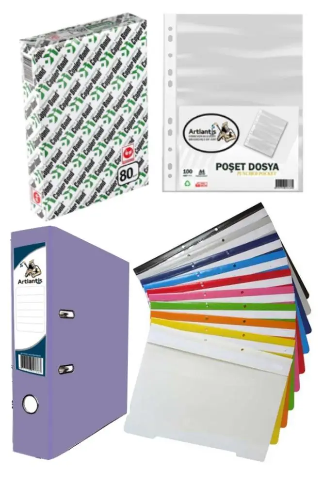 Ürün Adı: Fotokopi Kağıdı Lila Büro Klasörü Telli Dosya ve Poşet Dosya Seti 1 Adet Büro Klasörü 10 Renk Telli Dosya 100 Adet Poşet Dosya