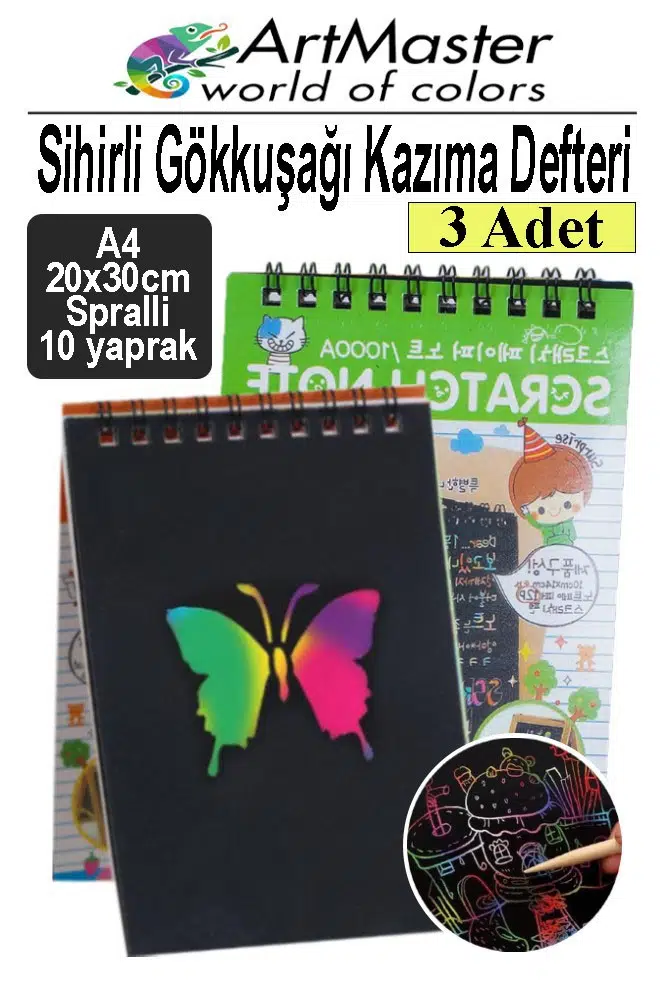 Ürün Adı: Artmaster Gökkuşağı Kazıma Defteri Sihirli A4 20x30 cm 3 Paket 10 Sayfa Spiralli Scratch Note Spralli Siyah Sihirli Resim Defteri