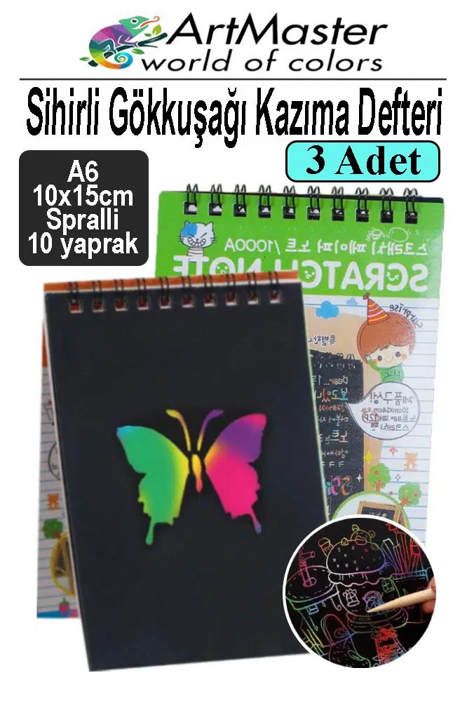 Ürün Adı: Artmaster Gökkuşağı Kazıma Defteri Sihirli A6 10x15 cm 3 Paket 10 Sayfa Spiralli Scratch Note Spralli Siyah Sihirli Resim Defteri
