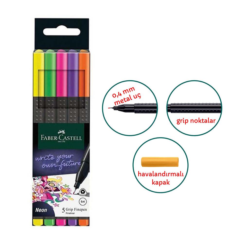 Ürün Adı: Grip Finepen 0.4 Mm Fineliner Neon 5 Renk 1 Paket Faber Castell Keçe Uçlu Kalem 2022 Neon Renkler 5 li 1 Paket
