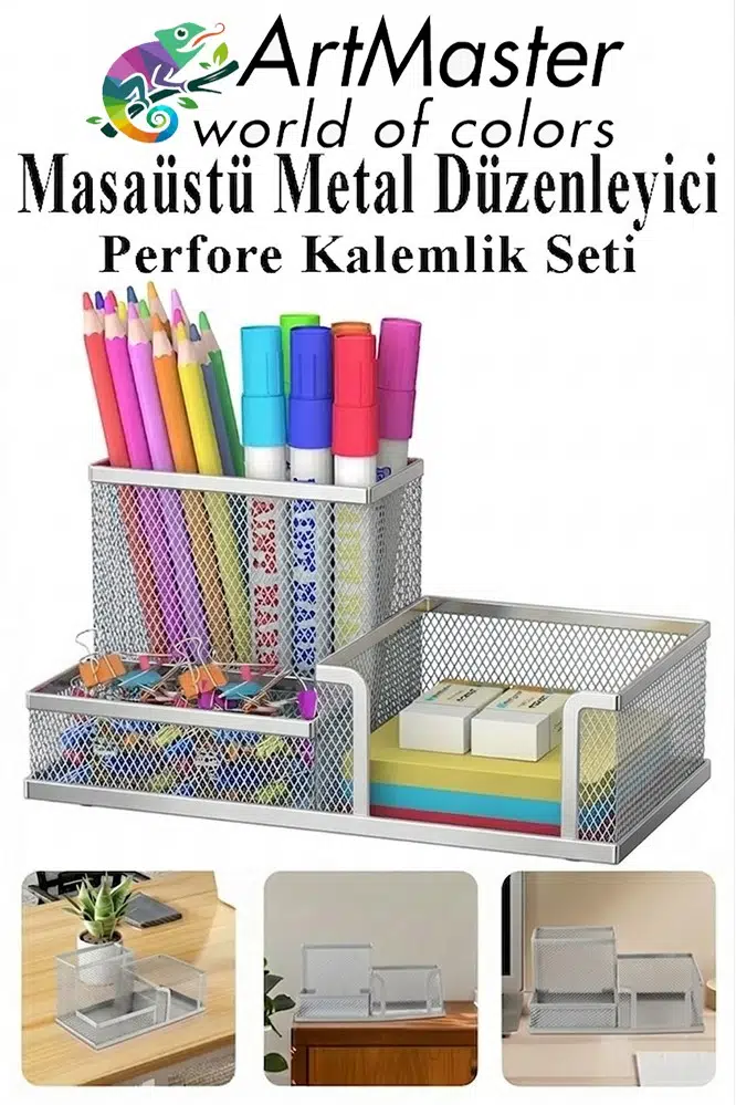 Ürün Adı: Artmaster Gümüş Gri Masaüstü Metal Kalemlik Seti 3 lü Kombo 1 Paket Fileli Perfore Renkli Kalemlik Kağıtlık Küpnotluk Düzenleyici