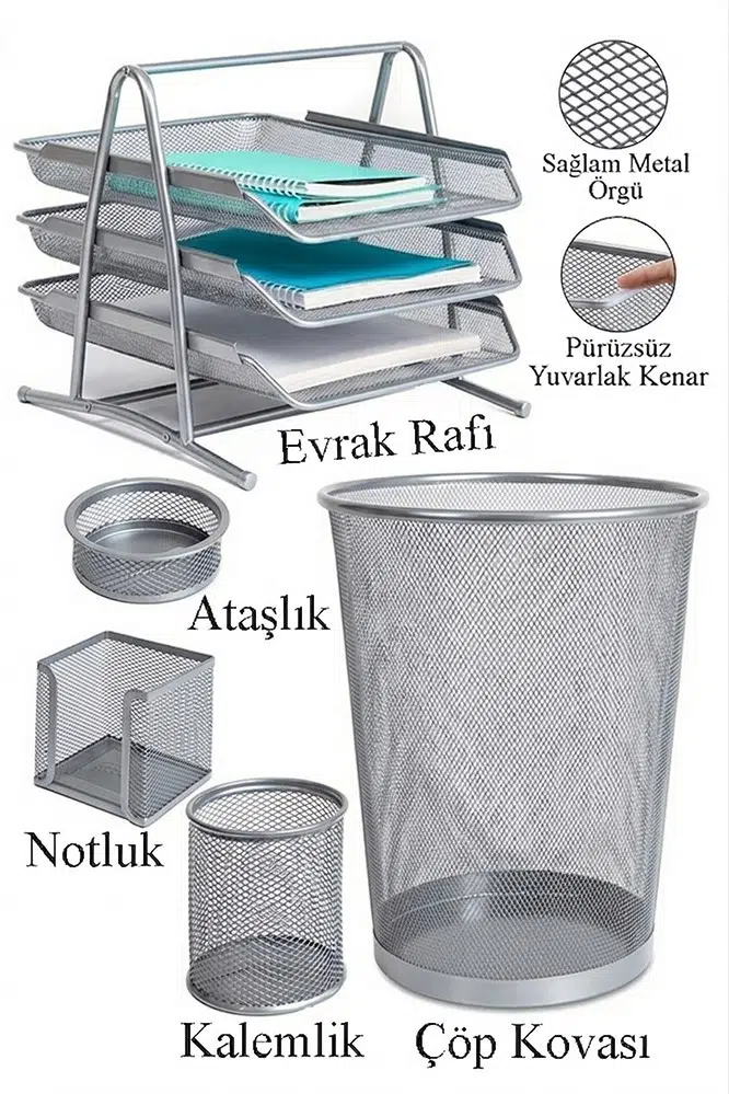 | Etiketler | Gümüş Gri Metal Evrak Rafı 3 lü Masaüstü Kalemlik 3 lü ve Fileli Çöp Kovası 1 Paket Masaüstü A4 Dosya Düzenleyici Not |
