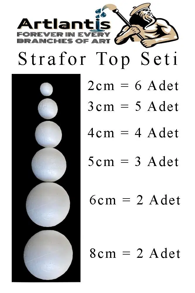 - Strafor köpük Top *2 cm 6 adet - *3 cm 5 adet - *4 cm 4 adet - *5 cm 3 adet - *6 cm 2 adet - *8 cm 2 adet - toplam 22 adet gönderim yapılmaktadır