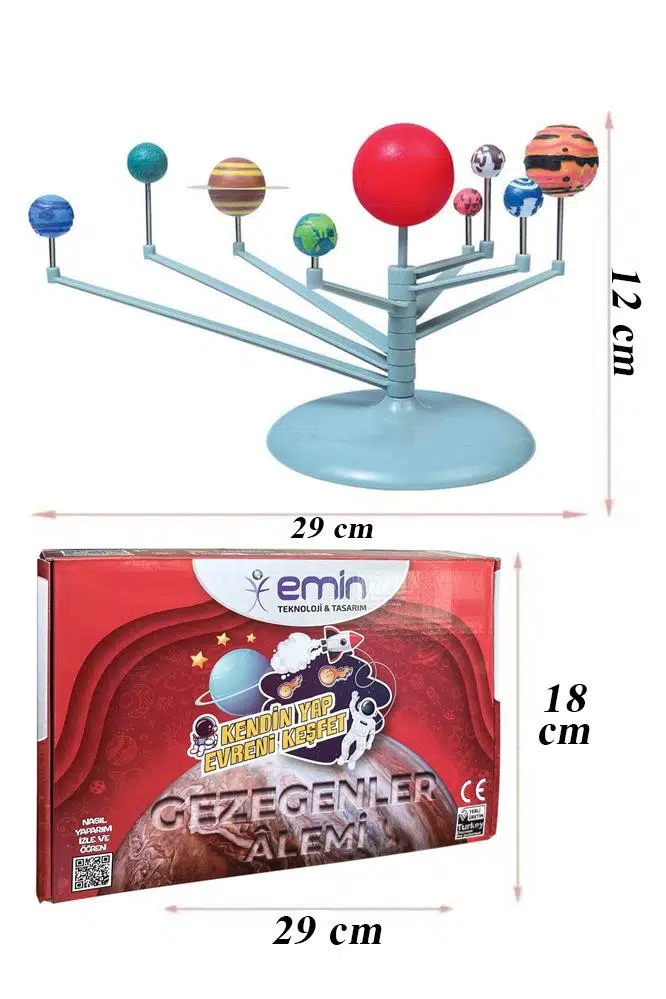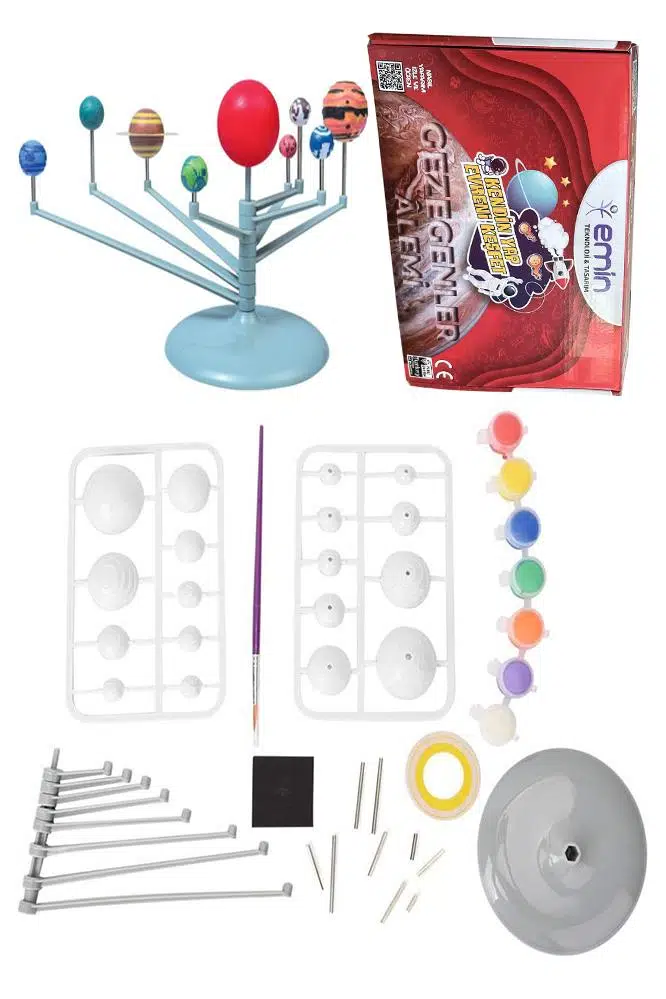 - AYAKLI GÜNEŞ SİSTEMİ VE GEZEGENLER MODELİ Galaksiler ve Evren tüm gizemleriyle tarafınızdan keşfedilmeyi bekliyor! Güneş Sistemini oluşturup detaylarını incelemek güzel bir başlangıç olacaktır. Edineceğiniz bilgiler karşısında evrene hayran kalacaksınız. Güneş Sisteminizi Kendiniz yapın! Çelik Çubuk, Saturn halka şablonu, takım stant ayağı ve döner kollar, takım üç boyutlu güneş sistemi gezegenleri, fırça ve şerit boya kutusu, Güneş Sistemi Hazırlama Modeli Galaksiler ve Evren tüm gizemleri ile keşfedilmeyi bekliyor! Güneş Sistemini oluşturup detaylarını incelemek güzel bir başlangıç olacaktır. Edineceğiniz bilgiler karşısında evrene hayran kalacaksınız. Ürün Özellikleri: Kendi güneş sistemi modelinizi oluşturun. Steam projeleri, fen ve teknoloji ödevleri için tasarlanmış bir settir. Set içerisinden çıkan toplarla ve materyallerle talimatlara uyarak güneş sistemi modelinizi oluşturabileceğiniz bir aktive setidir. Kurulu Ölçüsü: 29 x 29 x 12 cm Yaş Aralığı: 7+ Yaş