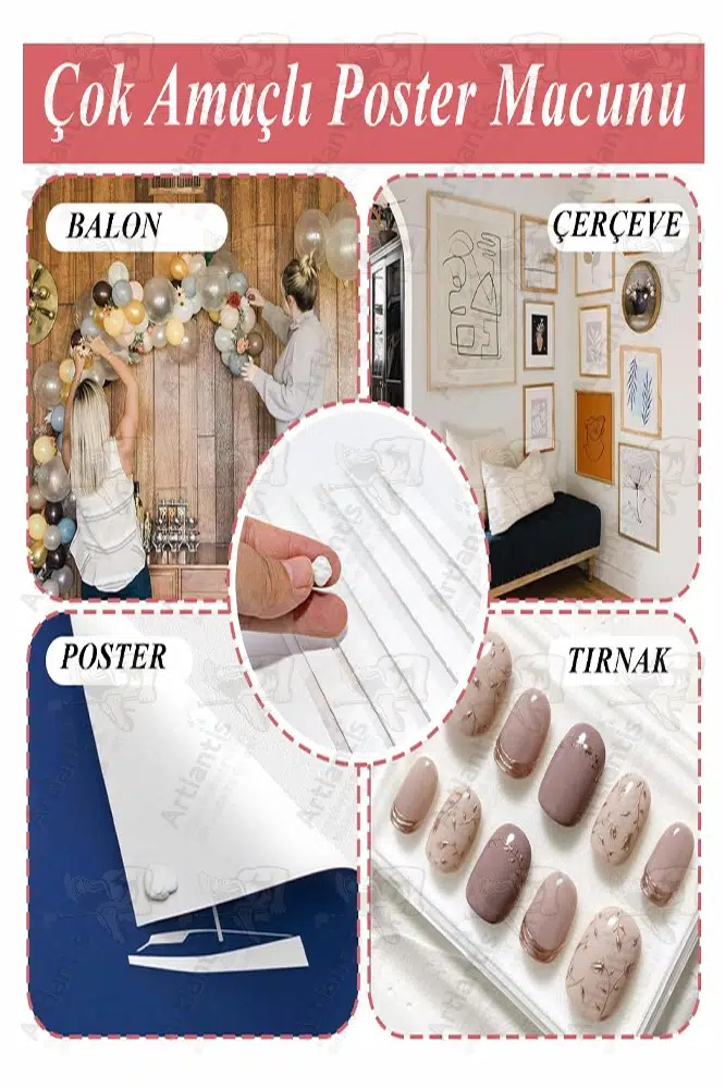 Yapışkan hamur sakız macun, resim, poster, not, süs, hatırlatma, çocuk sanat eseri ve parti dekorasyonlarını asmak için idealdir. Cam veya kırılgan nesneler için uygun değildir. Sanatsal çalışmalarınızı veya tırnak sanatınızı sabitlemek için mükemmel bir araçtır. Temiz duvarınızda delik açmaktan kurtulun. Hayal gücünüzü ve yaratıcılığınızı harekete geçirerek istediğiniz gibi kullanın.