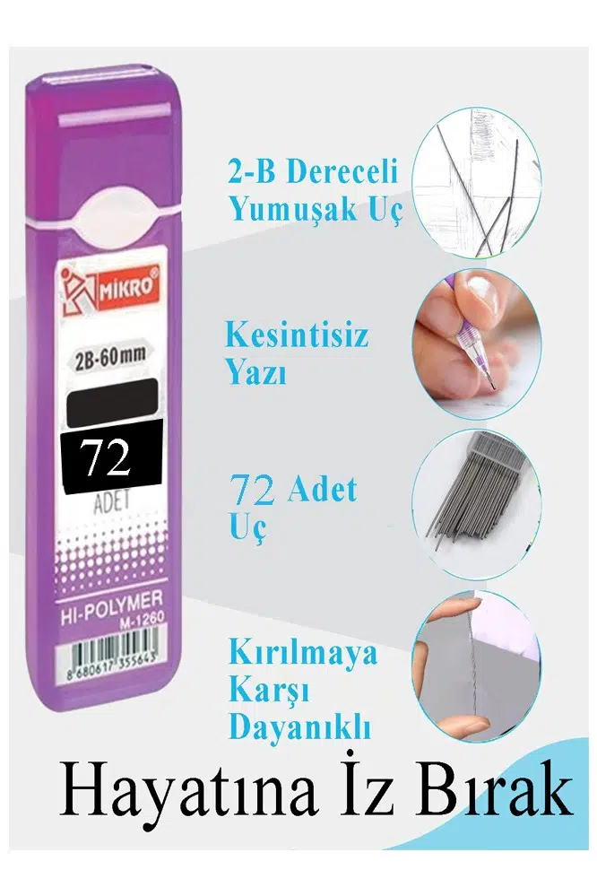 Toplam 72 adet 2B dereceli yumuşak kalem ucu, uç 60 mm uzunluğunda, Yüksek kaliteli reçineden yapılmıştır, dayanıklıdır, solmaya karşı dayanıklıdır ve yazması pürüzsüzdür, uzun ömürlü yazma sağlar.Uçların siyah reçineden yapılmış olduğunu belirtmekte fayda var. Bu mekanik kalem uçları, teslimat sırasında bir kutuda gelir, düşünceli bir hediye olarak saklamaya ve sunmaya hazırdır.