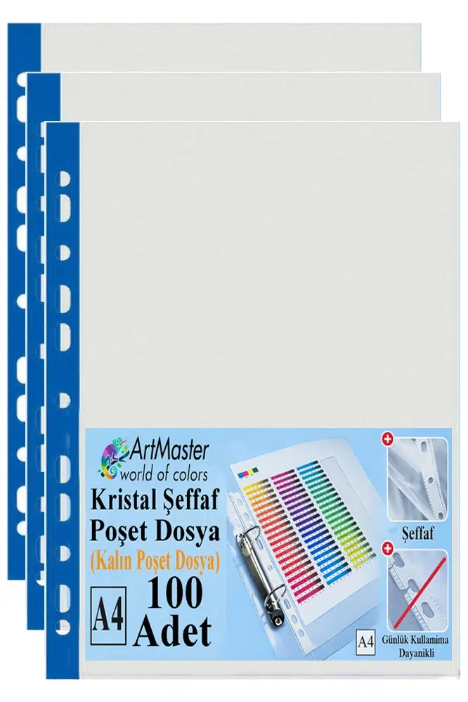 Ürün Adı: Artmaster Kalın Poşet Dosya A4 Kristal 100 Adet Kalın Poşet Dosya Föy Mavi Şeritli 100 Mikron Şeffaf Belge Arşivleme Büro Ofis