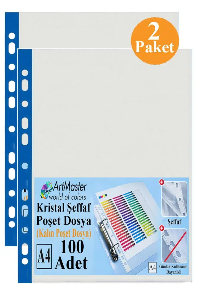 Ürün Adı: Artmaster Kalın Poşet Dosya A4 Kristal 100 lü 2 Paket Kalın Poşet Dosya Föy Mavi Şeritli 100 Mikron Şeffaf Belge Arşivleme Büro