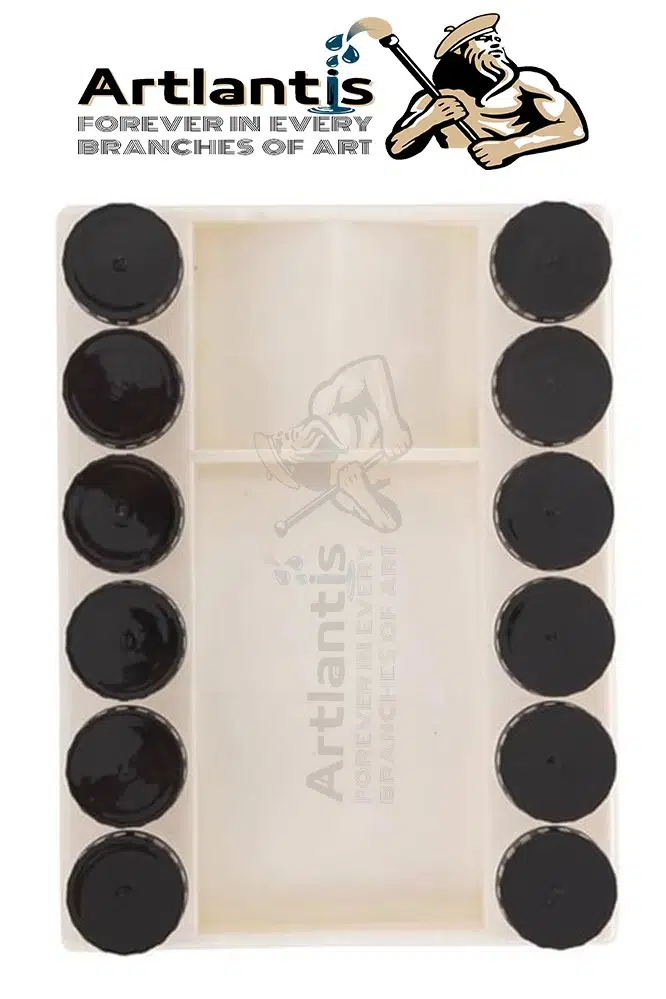 12 ayrı şeffaf kap içeren beyaz plastik boyama paletleri. Boyaları saklamak için şeffaf plastik kaplar ve kapaklar. 16X21 CM