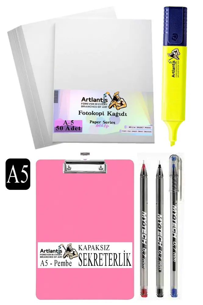 Ürün Adı: Kapaksız Sekreterlik A5 Tükenmez Kalem 3 Renk A5 Beyaz Fotokopi Kağıdı 50 Adet Fosforlu Kalem Sarı Ofis Büro Okul