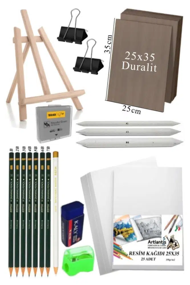 Ürün Adı: Karakalem Eskiz Çizim Masa Üstü Şövale Duralit Seti 25x35 cm Pastel Dağıtıcı Dereceli Kalem Hamur Silgi Beyaz Kurşun Kalem
