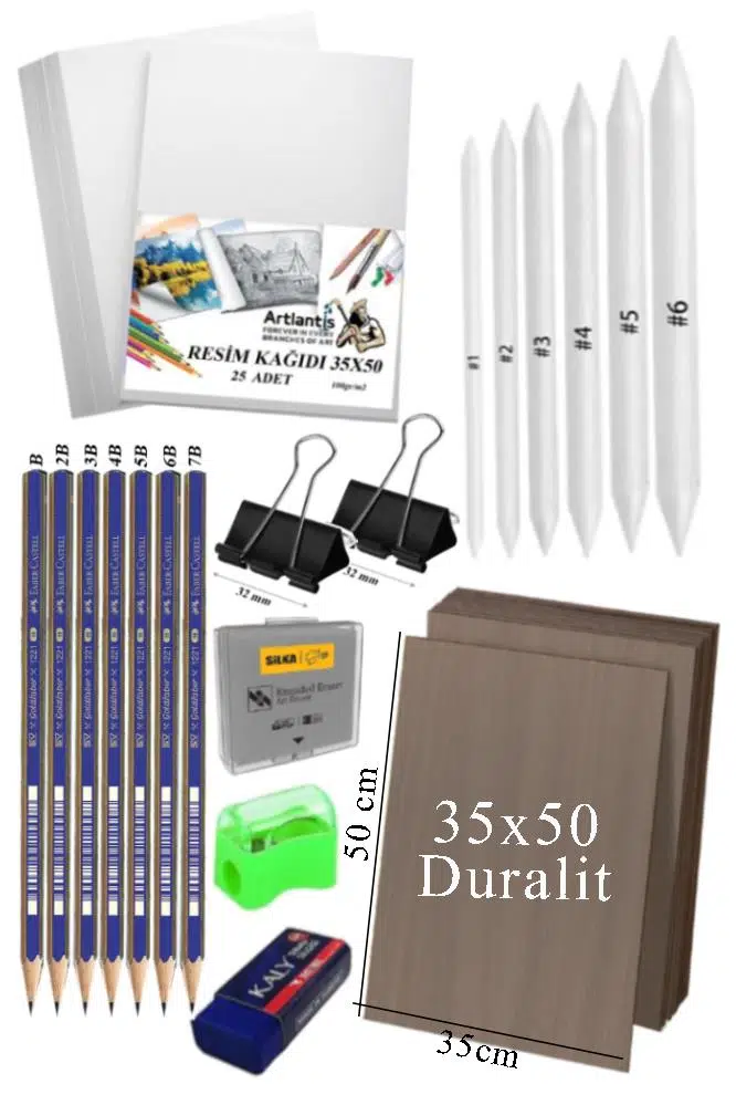 | Etiketler | Karakalem Eskiz Çizim Seti Durolit Seti 35x50 cm 1 Paket Pastel Dağıtıcı Kalem Resim Kağıdı Faber Dereceli Kalem Seti Hamur Silgi Sınav Silgisi |