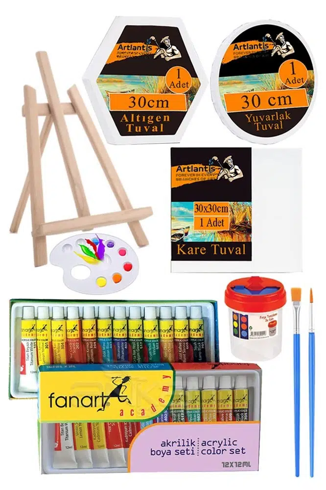 Ürün Adı: Kare Yuvarlak ve Altıgen Tuval 30 cm 12 Renk 75 ml Akrilik Boya Şövale 1 Paket 30x30 cm Arkadan Zımbalı Astarlı Resim