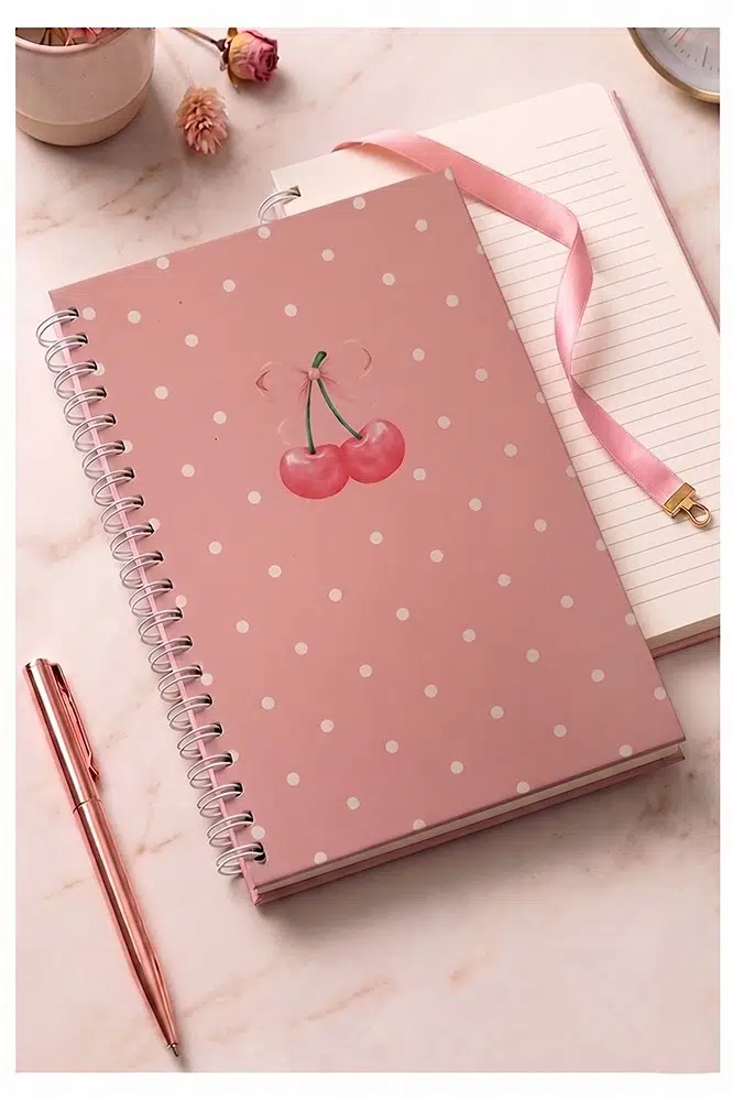 Ürün Adı: Kiraz Desenli Pembe Sert Kapak Spiralli Çizgili Defter 17x24cm 120 Yaprak 1 Adet Not Defteri Okul Büro Ofis Defteri