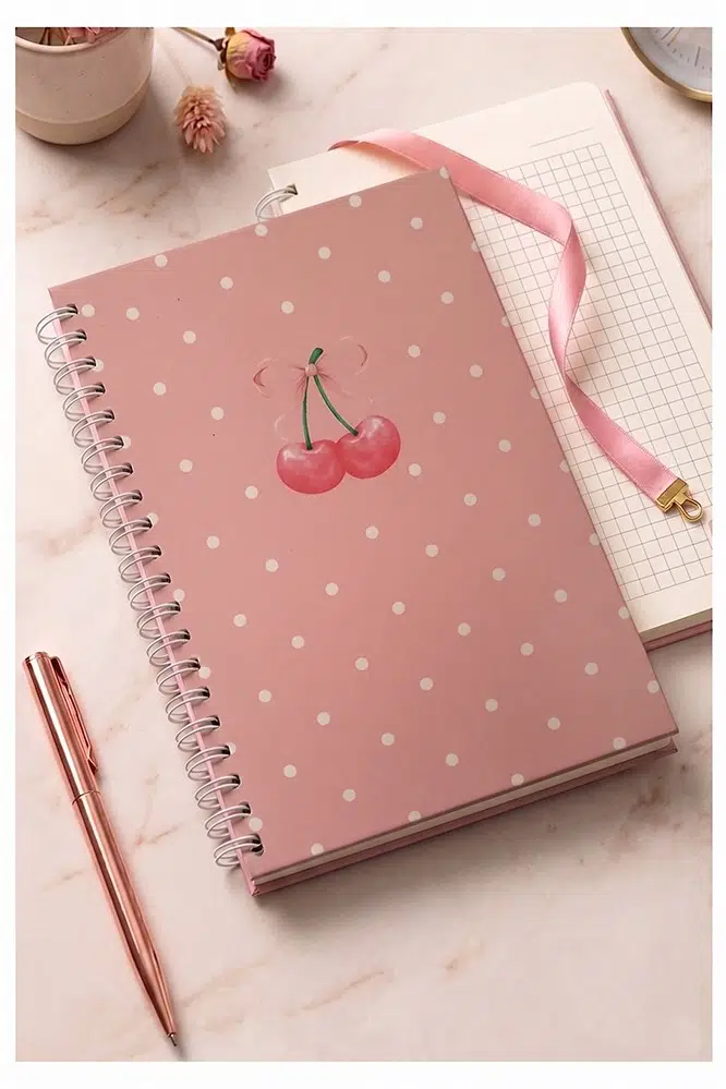Ürün Adı: Kiraz Desenli Pembe Sert Kapak Spiralli Kareli Defter 17x24cm 120 Yaprak 1 Adet Not Defteri Okul Büro Ofis Defteri